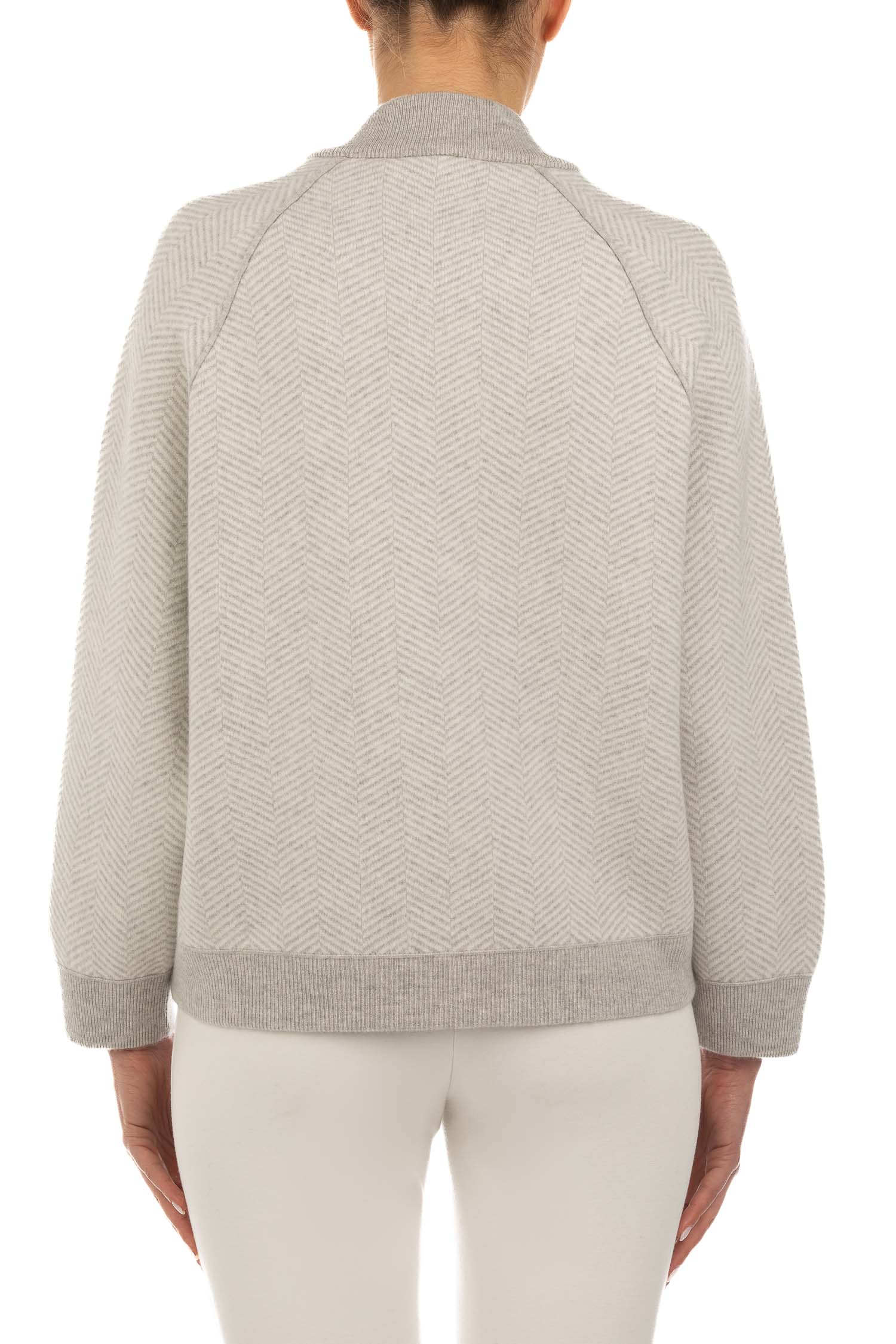 Gestrickte, hellgrau/weisse Jacke mit Fischgrat Muster im Bomber Stil. Details in gestrickter Rippe. Aufgesetzte Taschen. Doppelreissverschluss.