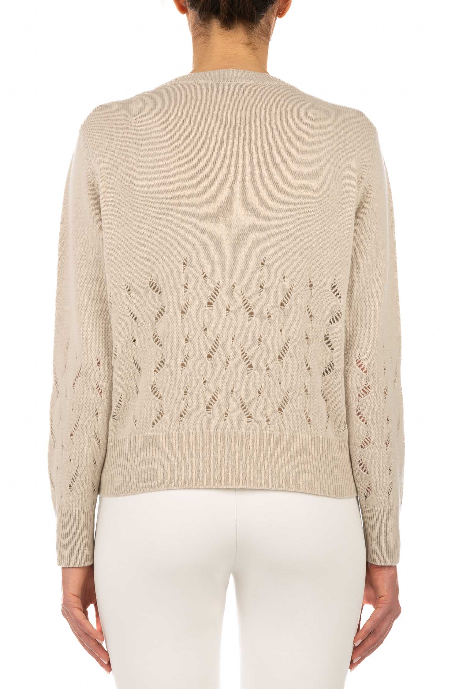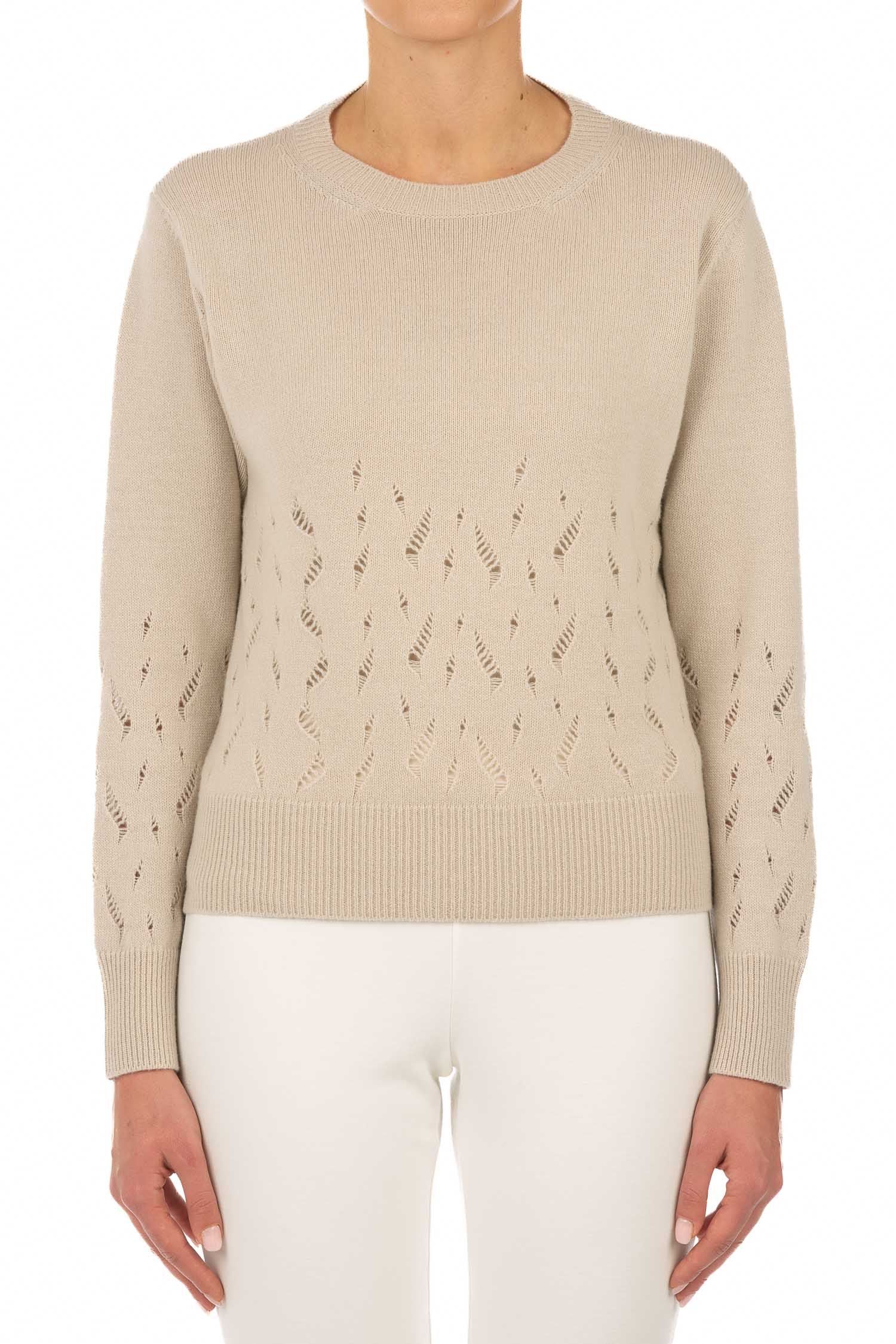 Feiner, beiger Pullover aus Schurwolle mit modischem Lochmuster