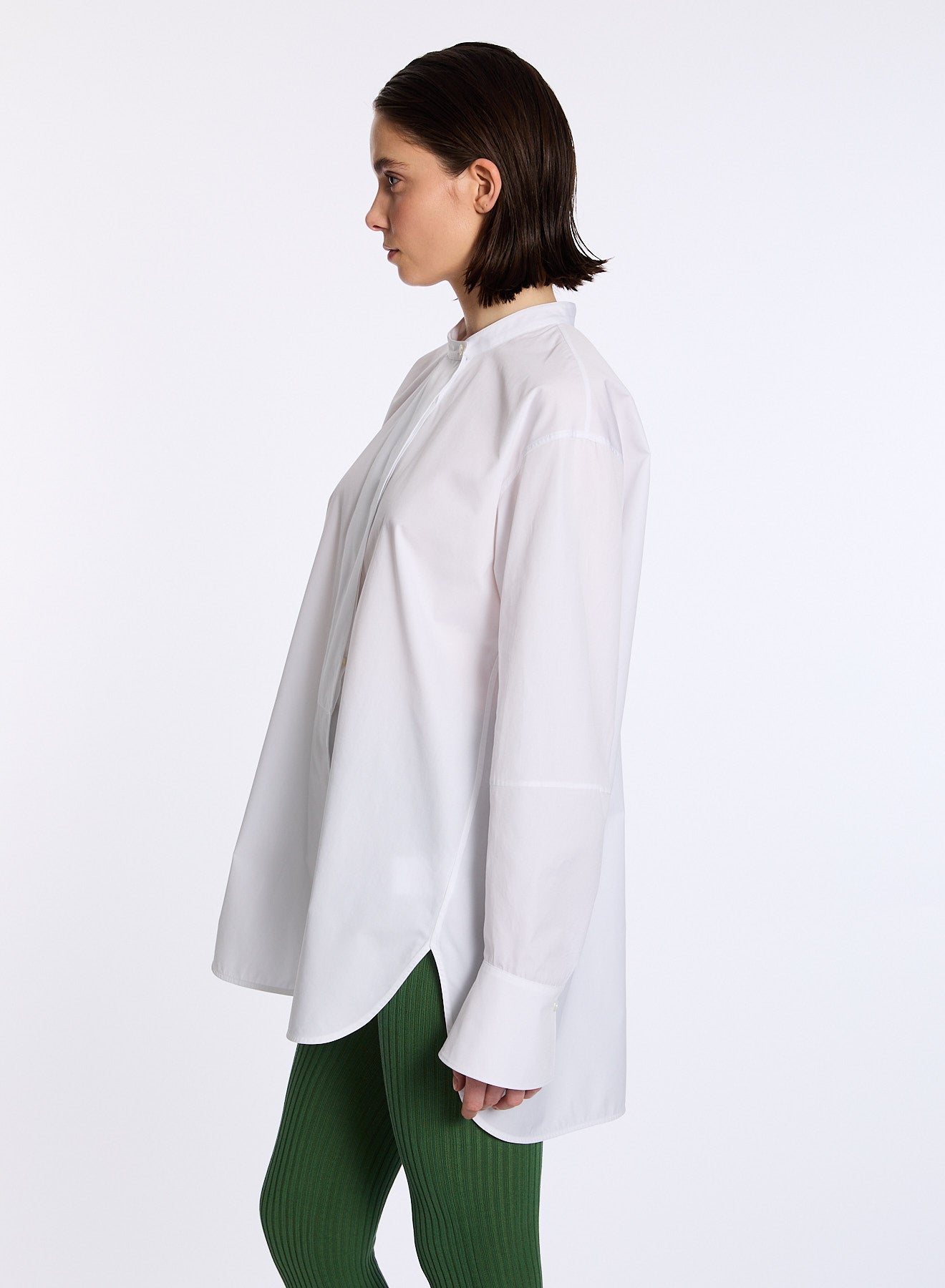 Feine Baumwoll Bluse mit raffiniertem Schnitt. Verdeckte Doppelknopfleiste bis zur vorderen Mitte. Unterer Teil offen. Gerundeter Saum. Rückenteil mit Fältchen. Manschetten mit Knopf