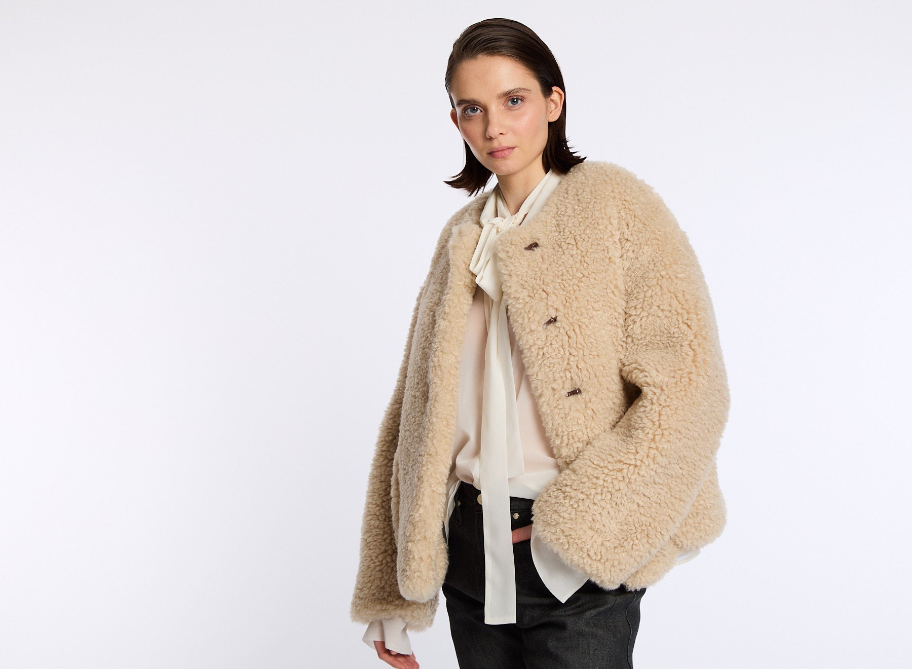 Trendige, super flauschige Kunstpelz Teddyjacke in Beige mit Hakenverschluss. Aufgesetzte Taschen.